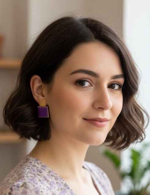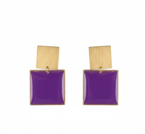 Pendientes de cuadro pequeños! Son fáciles de combinar, ideal para todos los días. Hechos artesanalmente en nuestro taller del centro de Madrid, en latón y resina esmaltada color morado. Pendientes para toda la vida. Medidas: cuadrado base en latón (1,50 cm x 1,50 cm) - cuadrado pintado en resina esmaltada (2,50 cm x 2,50 cm).