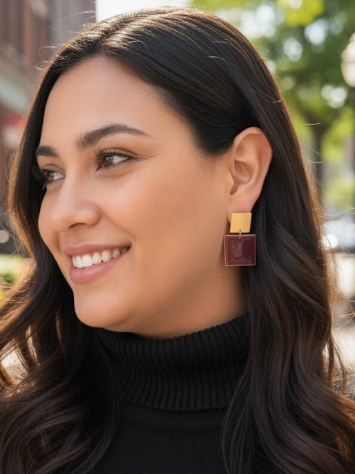 Pendientes de cuadro pequeños color vino. Son fáciles de combinar, ideales para todos los días. Hechos artesanalmente en nuestro taller del centro de Madrid, en latón y resina esmaltada. Pendientes para toda la vida. Medidas: cuadrado base en latón (1,50 cm x 1,50 cm) - cuadrado pintado en resina esmaltada (2,50 cm x 2,50 cm).