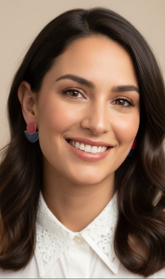 Los pendientes Semi Fucsia y azul marino son una explosión de frescura y color. Su diseño combina un círculo de resina pintado a mano en fucsia, de 1.5 cm de diámetro, con un semicírculo en azul marino que aporta equilibrio.
