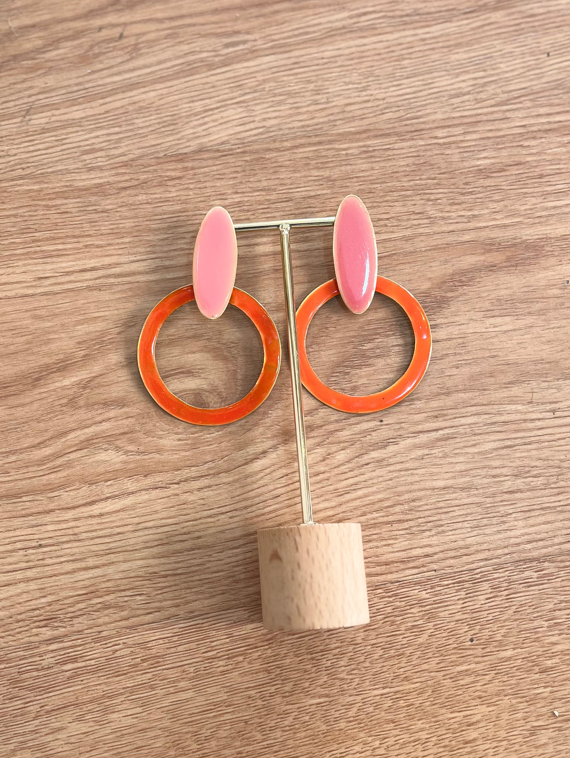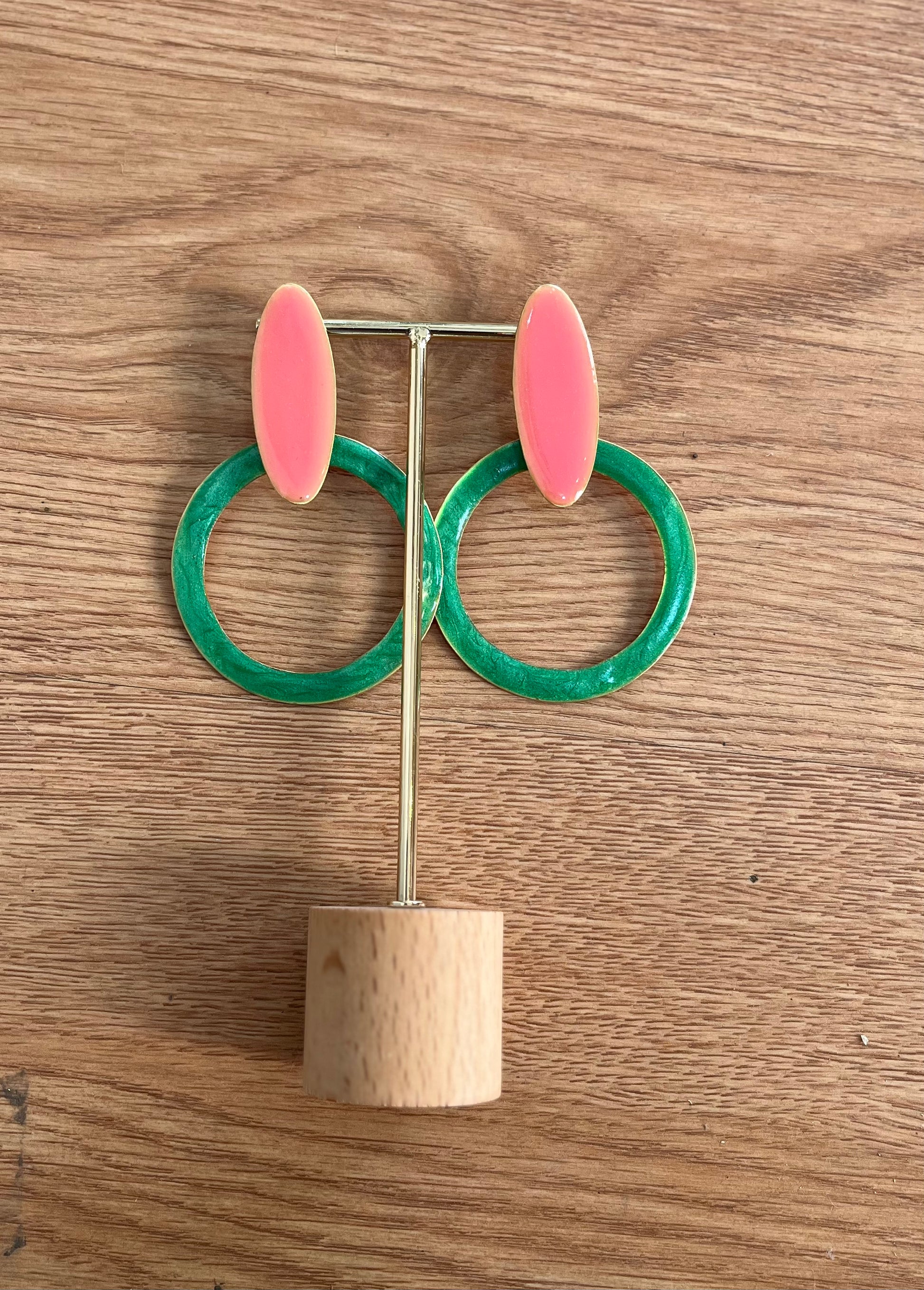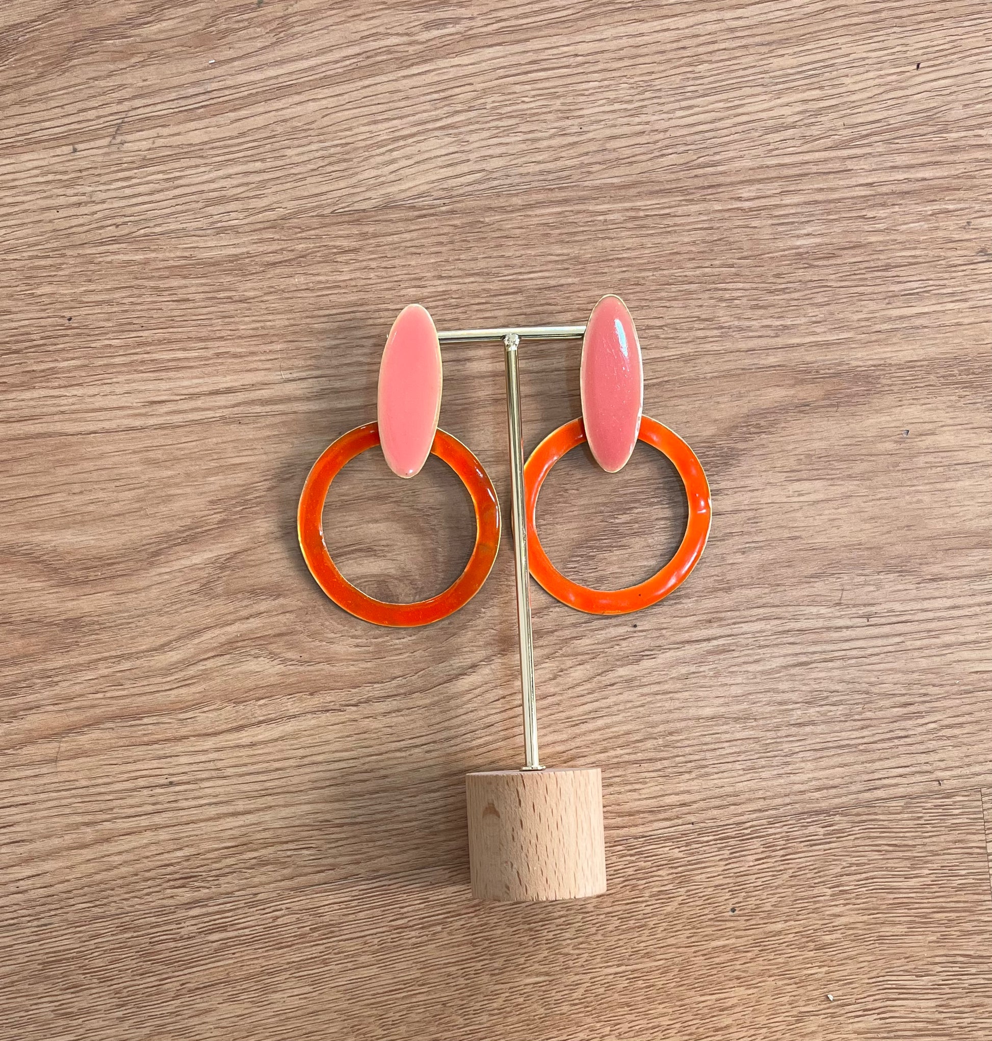Estos pendientes Maxi Maxi son como un pequeño baile de colores que puedes llevar puesto todos los días. El diseño ovalado en rosa pálido se acompaña de un círculo reversible que cambia entre verde y naranja, para que tú elijas cómo combinarlos según tu estado de ánimo o look.