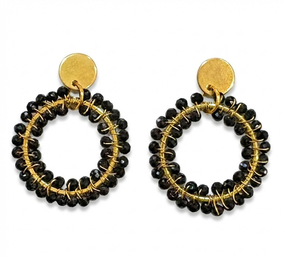 Estos pendientes únicos combinan la resistencia del acero inoxidable con la delicadeza del hilo de latón tejido a mano. Cada pieza está elaborada artesanalmente, destacando la técnica tradicional de tejido que envuelve una anilla de acero, creando un diseño elegante y original. Disponibles en varios colores de cristales, aportan brillo y personalidad a cualquier look. Perfectos para quienes buscan joyería artesanal, hecha a mano y con materiales de alta calidad como acero y latón.