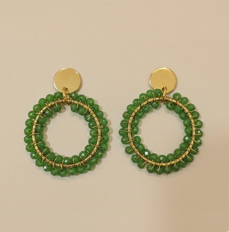 Estos pendientes únicos combinan la resistencia del acero inoxidable con la delicadeza del hilo de latón tejido a mano. Cada pieza está elaborada artesanalmente, destacando la técnica tradicional de tejido que envuelve una anilla de acero, creando un diseño elegante y original. Disponibles en varios colores de cristales, aportan brillo y personalidad a cualquier look. Perfectos para quienes buscan joyería artesanal, hecha a mano y con materiales de alta calidad como acero y latón.