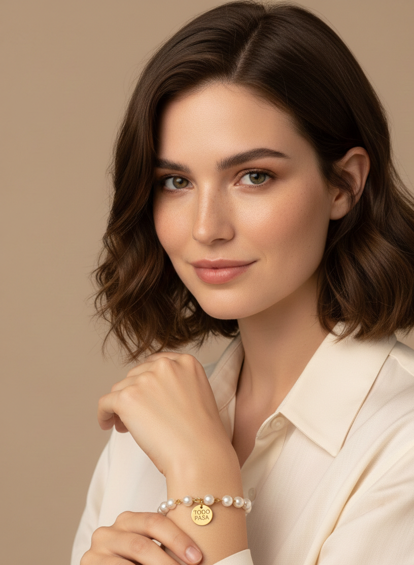 La Pulsera Todo Pasa es una pulsera de perlas naturales y acero con medalla grabada, diseñada como joya con mensaje para acompañarte en cada etapa de tu vida.